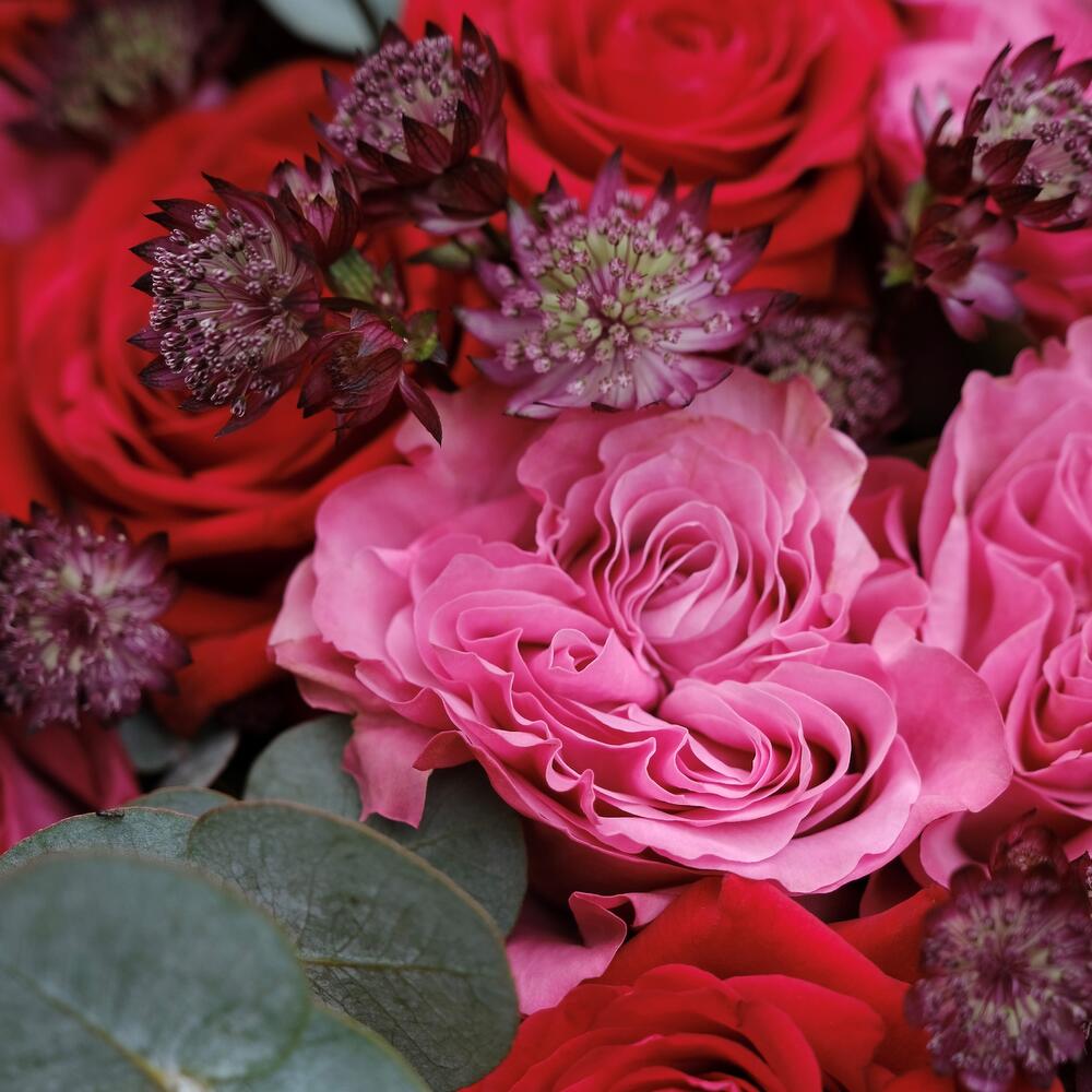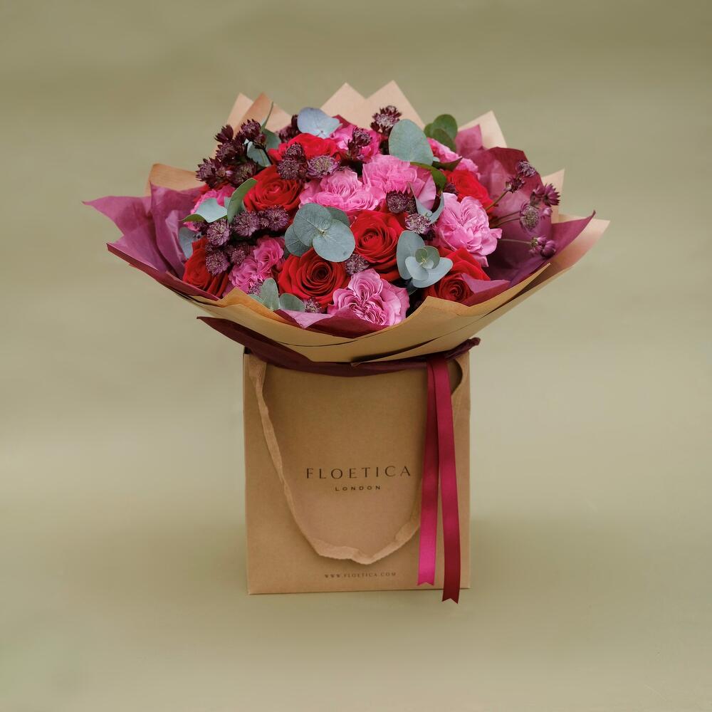 A bouquet of timeless elegance and enchanting beauty. This captivating arrangement features 10 luxurious velvet red roses, symbolizing deep passion and romance, complemented by 10 pink ruffled Ecuadorian roses, adding a delicate touch of femininity. Ten stems of astrantia, with their charming star-shaped blooms, bring a whimsical flair to the bouquet, while eucalyptus cinerea leaves provide a refreshing green accent and a hint of fragrance. Gabriella bouquet is a perfect expression of love and admiration, ideal for making any occasion truly memorable.