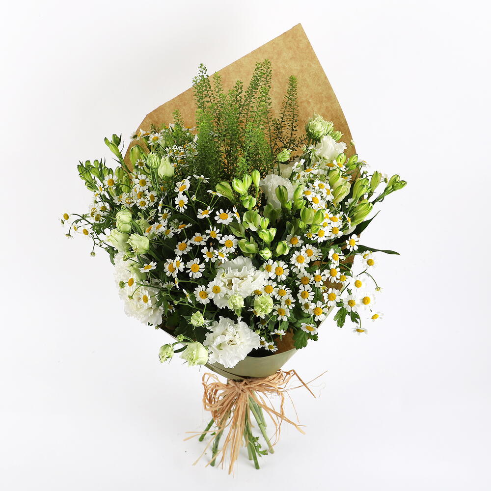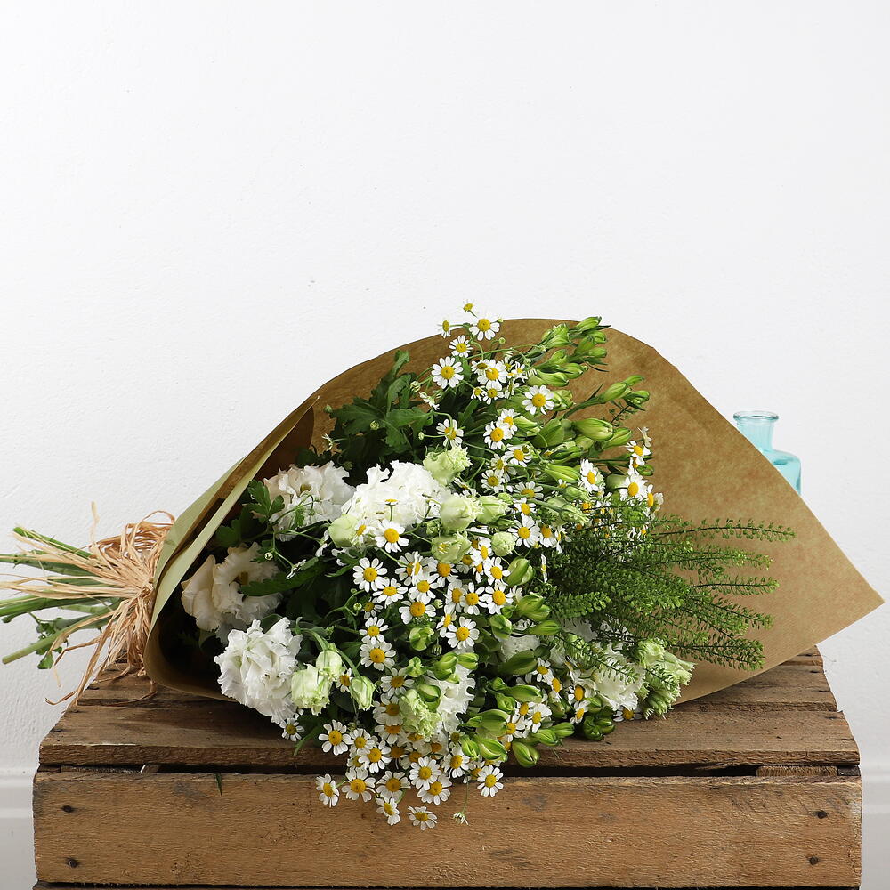 Delicate white alstroemeria and lisanthus blend harmoniously with the playful daisy and green bell. This arrangement captures the essence of natural beauty, evoking the sights and scents of a vibrant garden. Let this bouquet bring the beauty of nature indoors to brighten any space.