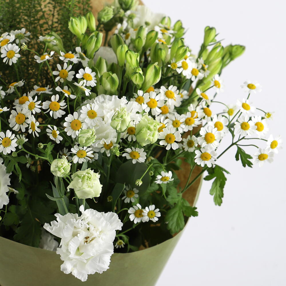 Alstroemeria - 4 pcs Lisianthus - 3 pcs Green bell - 3 pcs daisy - 4 pcs