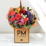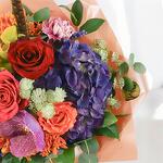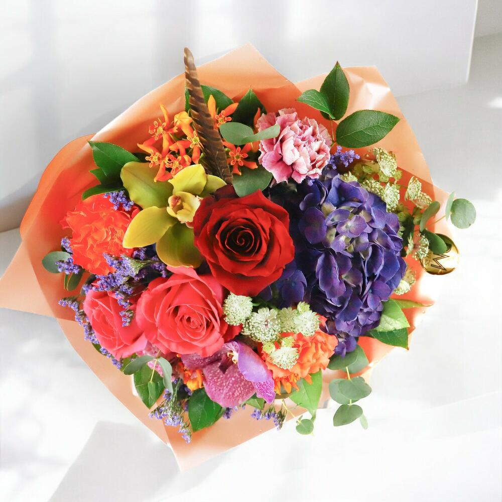 Make a statement with Gianni, a bold and artistic bouquet that bursts with color and character. Designed to impress, this arrangement features a vibrant mix of fiery red and coral roses, deep purple hydrangeas, golden cymbidium orchids, violet vanda orchids, airy limonium, wild astrantia, and accented eucalyptus, all crowned with a unique decorative feather for a touch of drama. This bouquet is a luxurious ode to creativity and flair. Care Instructions: Place the bouquet in clean water upon arrival and keep it in a cool space, away from direct sunlight and heating elements. Change the water daily and trim the stems diagonally every two days to prolong freshness and keep each bloom at its vibrant best.