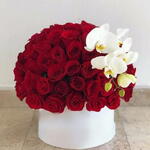 Gilded Love is a masterpiece of floral artistry, exuding sophistication and timeless romance. This elegant hat box arrangement features 100 velvety red roses, each one a symbol of deep passion and love. The rich crimson blooms create a lush, opulent base, embodying the essence of romantic devotion. Intertwined with the roses are the graceful blooms of white Phalaenopsis orchids, their delicate petals adding an ethereal contrast. The orchids bring an air of purity and elegance, enhancing the arrangement’s overall allure. Gilded Love is more than a floral arrangement—it’s a radiant expression of passion, elegance, and indulgence, making it the perfect gift to celebrate love in its most glorious form.