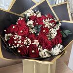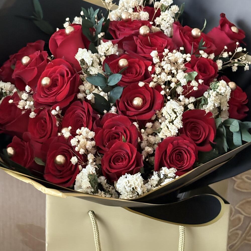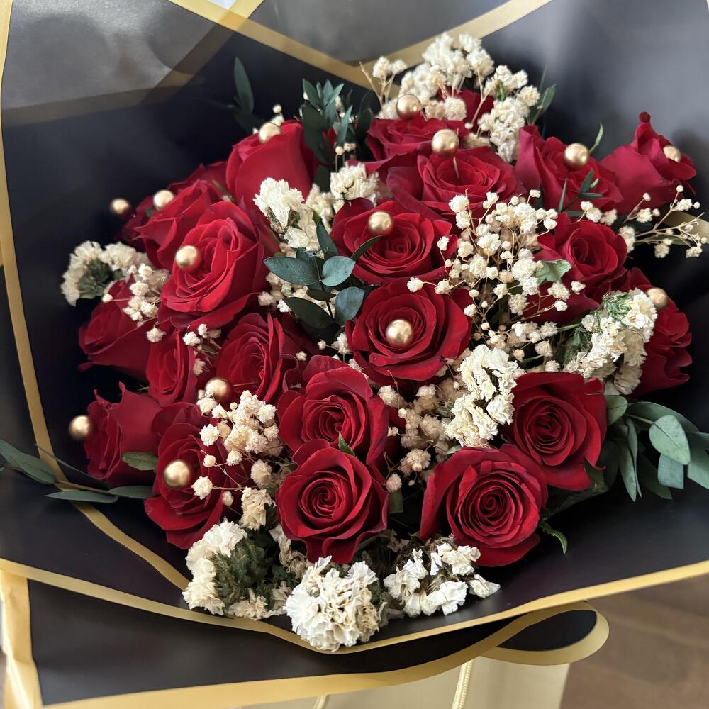 Red rose - 23 pcs Статике - 2 pcs Leaves - 4 pcs flower box - 1 pcs wrapping paper - 2 pcs baby breaths - 2 pcs gold berries - 4 pcs
