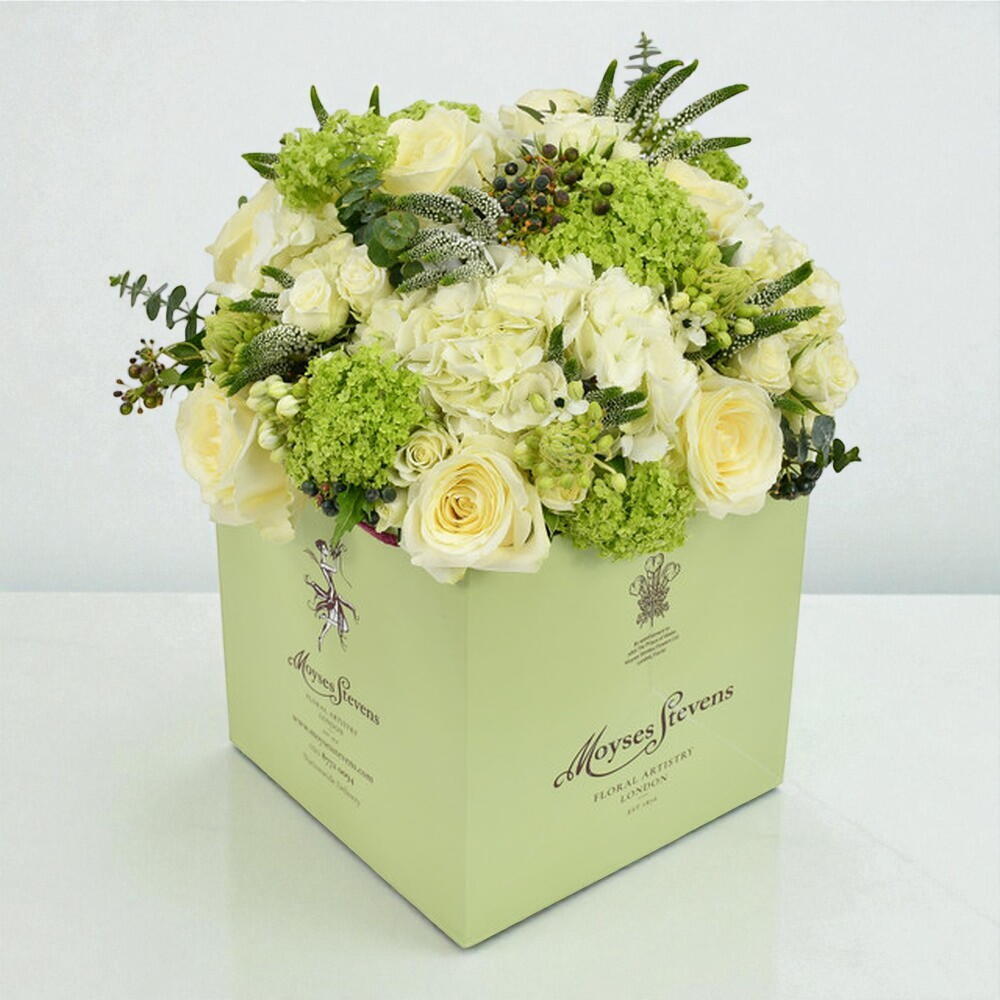 We don’t often profess favourites here at Moyses Stevens, but this bouquet is an exception to the rule. Loved by both florists and customers alike, it includes classic white hydrangea, white roses, white veronica, white spray roses, viburnum,vornitogalum, eucalyptus and ivy berries.