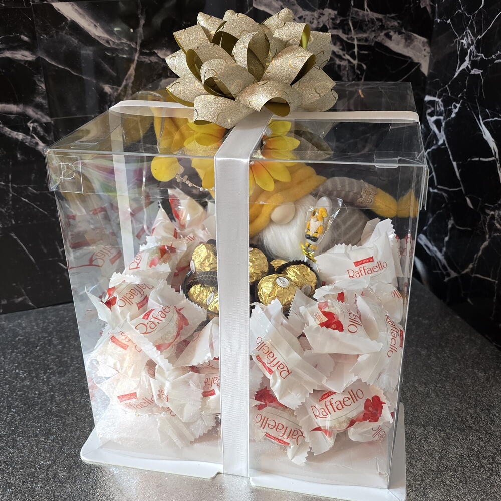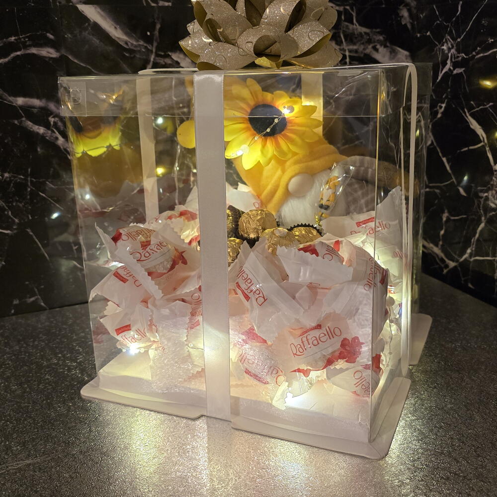 🌻 Handmade Sunflower Gnome Luxury Chocolate Gift Box Limited Edition – Only 10 Pieces Available This exclusive luxury gift box features a handmade sunflower gnome, carefully paired with a matching handmade sunflower gnome spoon and a decorative gnome glass bowl. Each box is individually assembled and presented in a premium transparent gift box with LED lighting, ribbon and elegant finishing – ready to gift. ✨ What’s inside: Handmade sunflower gnome (limited edition – only 10 made) Matching handmade sunflower gnome spoon Decorative gnome glass bowl Premium chocolate selection: Ferrero Rocher Raffaello Elegant LED lighting Luxury transparent gift box with ribbon 🎁 Perfect for: Birthdays Thank you gifts Home décor lovers Unique handmade gift collectors ⚠️ Once sold out, this design will not be restocked.