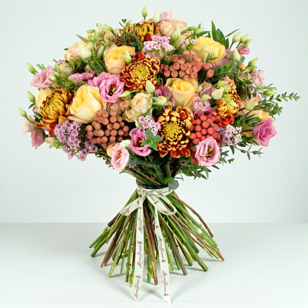 Brunia - 5 pcs Lisianthus - 6 pcs Wax flower - 5 pcs spray roses - 6 pcs garden roses - 6 pcs seasonal foliage (bunch) - 1 pcs chrystantemum - 5 pcs