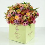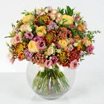 A radiant celebration of autumns golden hour. Bringing together the lush, romantic blooms of garden roses with delicate spray roses and soft eustoma in shades of blush and lavender. Bronze chrysanthemums add depth and drama with their intricate, sunset-kissed petals, while coral brunia berries provide unique texture and warmth. Gentle wax flowers weave through the arrangement like scattered starlight, and verdant foliage frames it all with natural elegance.
