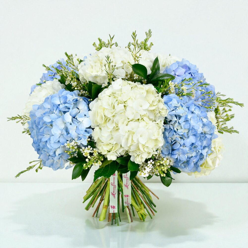 This dreamy bouquet is full of extra large hydrangeas, waxflower and seasonal foliages. Big pillowy blooms in gorgeous blue and white tones, this minimalist bouquet showcases the best features of hydrangea in a striking and classic bouquet.