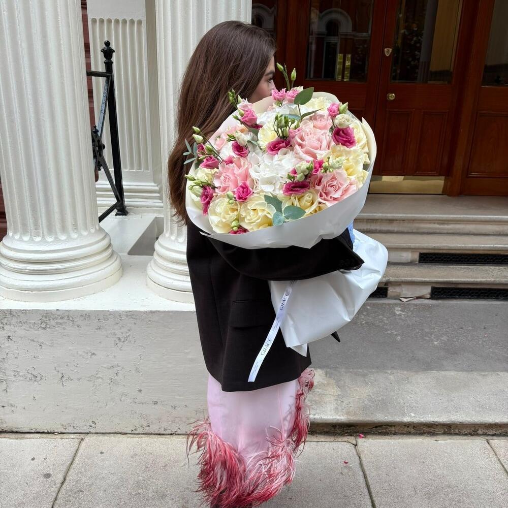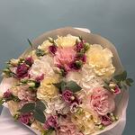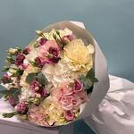 lisianthus pink - 6 pcs hydrangeas white - 9 pcs eucalyptus stems - 5 pcs roses pink mondial - 6 pcs roses mondial white - 9 pcs