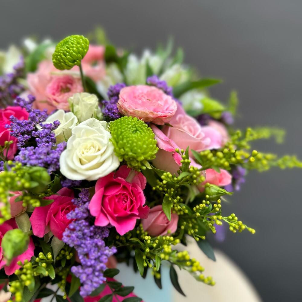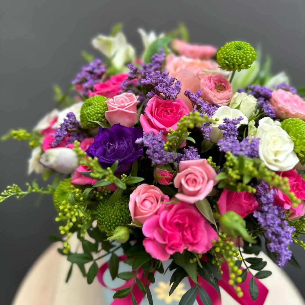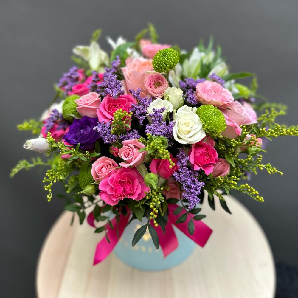 Ribbon - 1 pcs Spray rose - 10 pcs Chrysanthemum - 4 pcs Solidago - 3 pcs hat box - 1 pcs