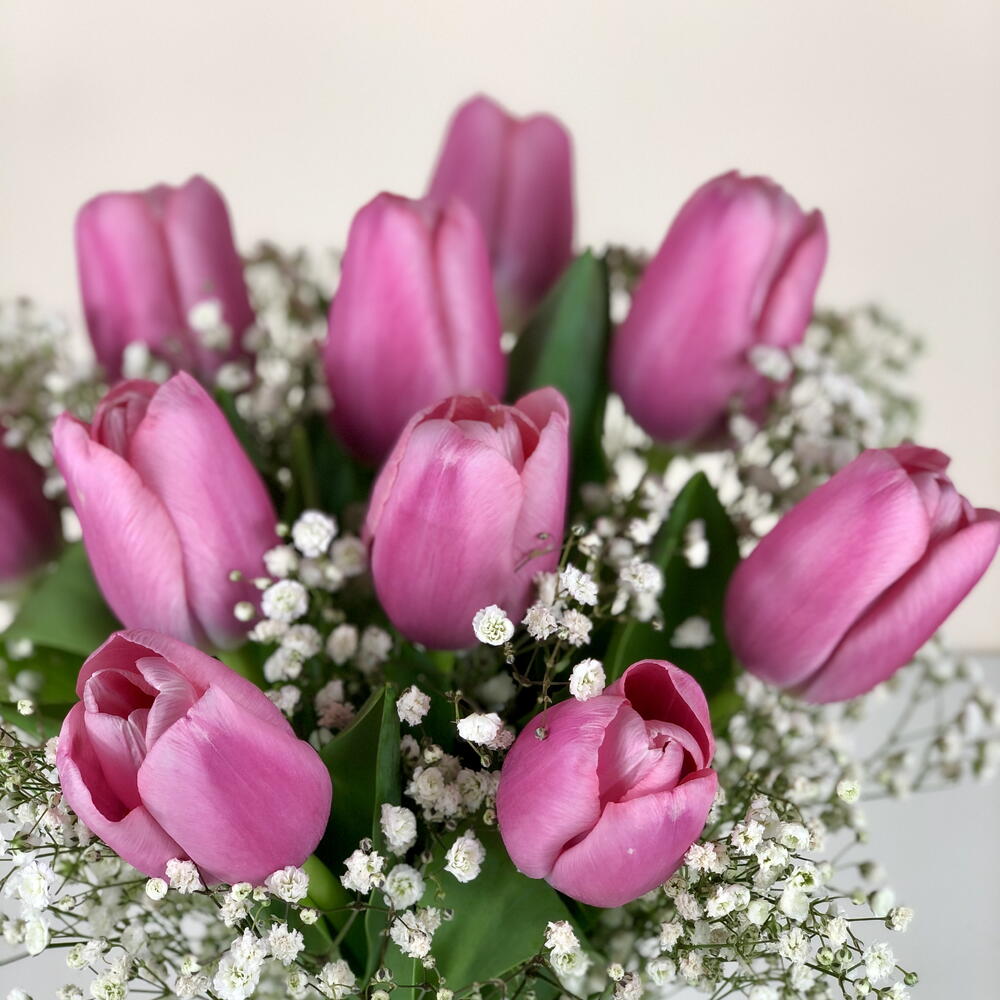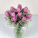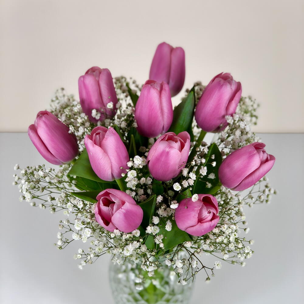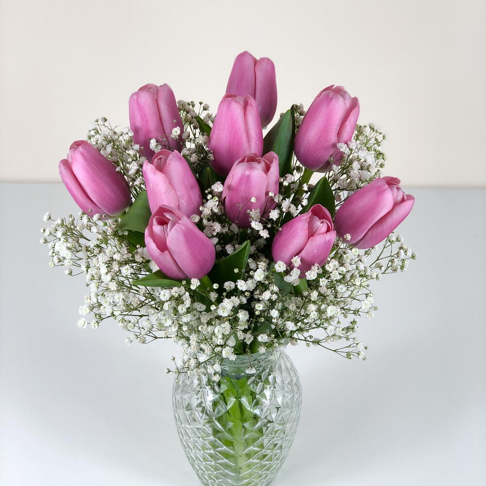 Gypsophila - 2 pcs Tulip - 10 pcs Vase - 1 pcs