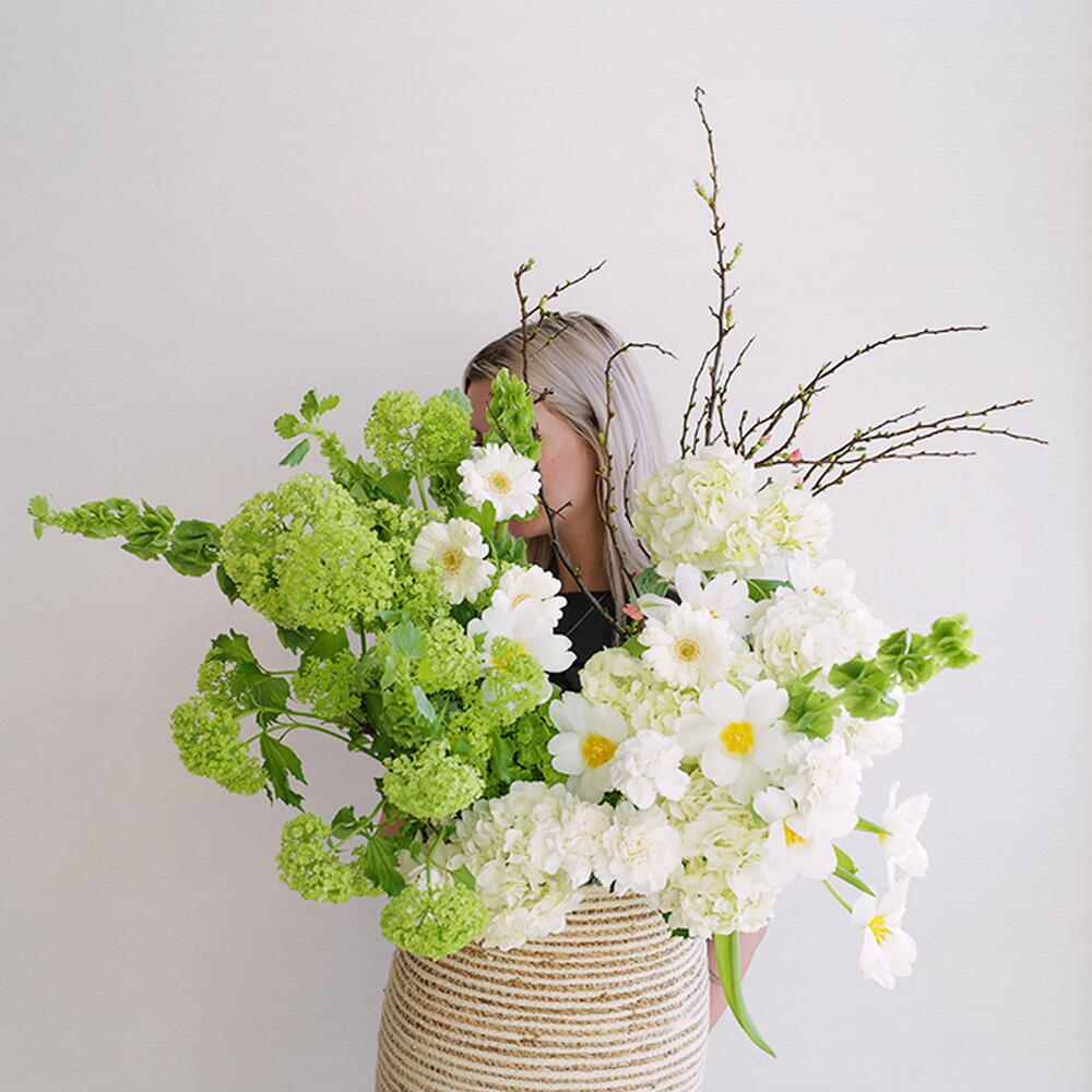 Ivory Meadow Basket is a fresh, nature-inspired arrangement in soft white and green tones. An airy composition of hydrangea, gerbera, chrysanthemums, and textured greenery creates a sense of lightness and natural movement. Designed as a statement piece, this basket brings calm elegance and a refined seasonal feel — perfect for interiors, celebrations, or thoughtful gifting. Arranged in a woven wicker basket with a natural, organic finish.