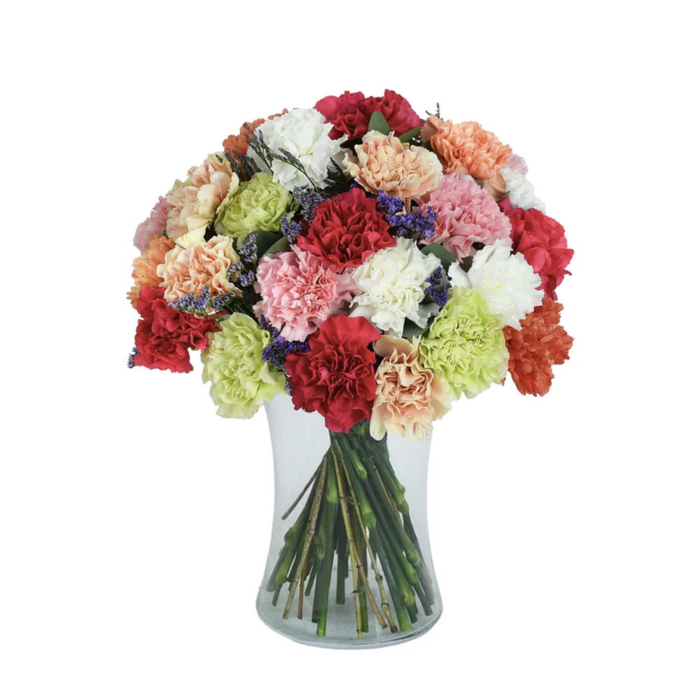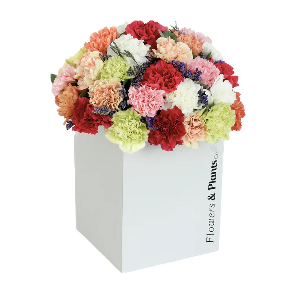 Vibrant mixed carnations in a playful array of hues are paired with delicate drifts of purple limonium, creating an arrangement that feels festive, fun and wonderfully uplifting. A beautiful gift for anyone who deserves a little extra brightness in their day.