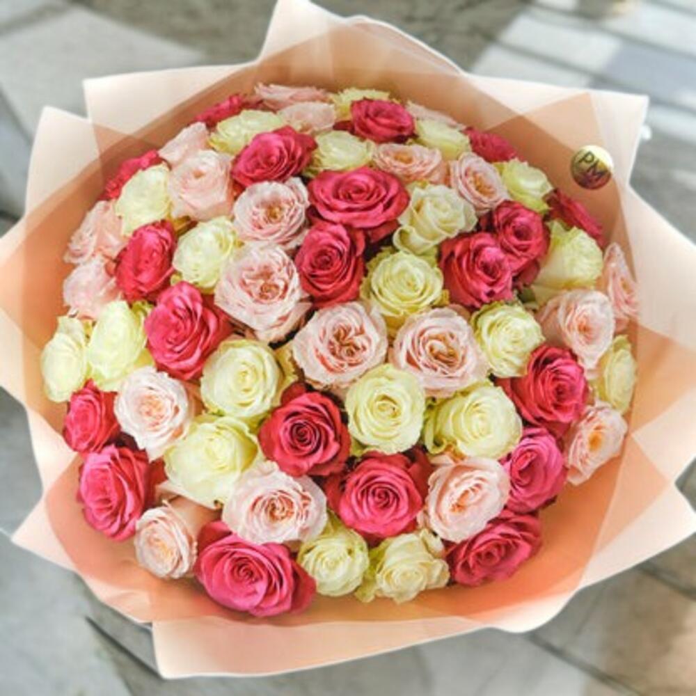 Meet Joy, a radiant celebration of color and emotion captured in one breathtaking bouquet. This luxurious arrangement features 60 premium roses in a vibrant medley of cerise pink, blush peach, and classic white. Each stem is meticulously hand-selected for its rich tone, full bloom, and longevity, ensuring a dazzling display that turns every moment into a memory. Whether youre marking a birthday, anniversary, engagement, or simply want to bring light to someones day, Joy is a bouquet that leaves a lasting impression. Hand-tied and beautifully wrapped in premium kraft paper, it arrives ready to wow. Care Instructions: To keep your Joy bouquet looking fresh, place it in a clean vase filled with cool water. Trim the stems at a 45-degree angle every 2–3 days and remove any leaves below the waterline. Refresh the water daily and keep the bouquet in a cool area away from direct sunlight or heat sources. With proper care, your roses will maintain their beauty and fragrance for up to a week or more.