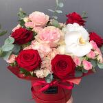 Flower arrangement in a box with roses, orchids and carnations.