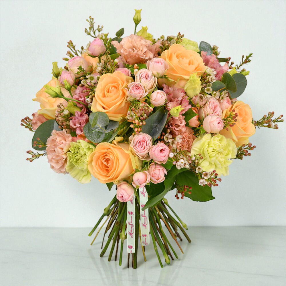 A wonderful mix of peach roses and delicate pink spray roses. The soft pastel shades are combined with some of our favourite long lasting flowers to create beautiful gift that will bring you joy over several days. Finished with eucalyptus and waxflower to give a soft and sweet aroma, this is arrangement is suitable for any occasion.