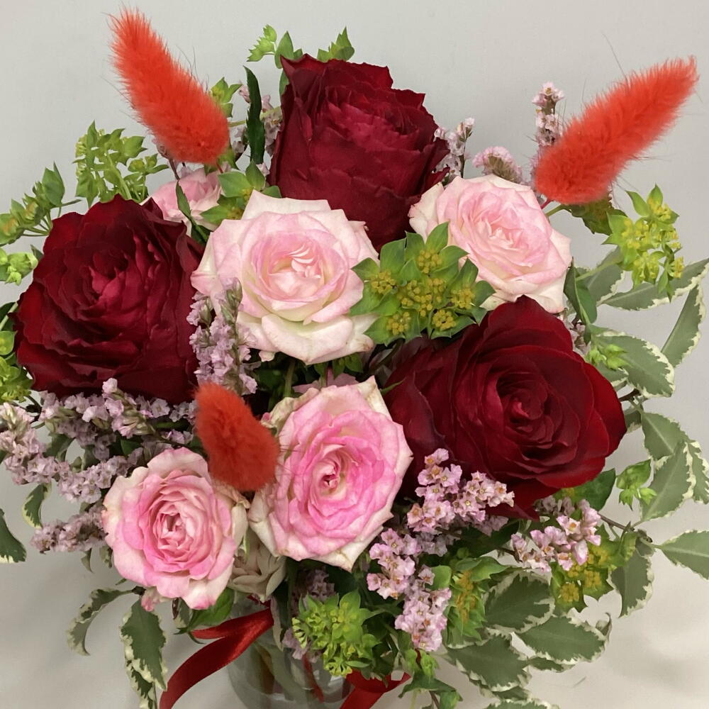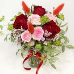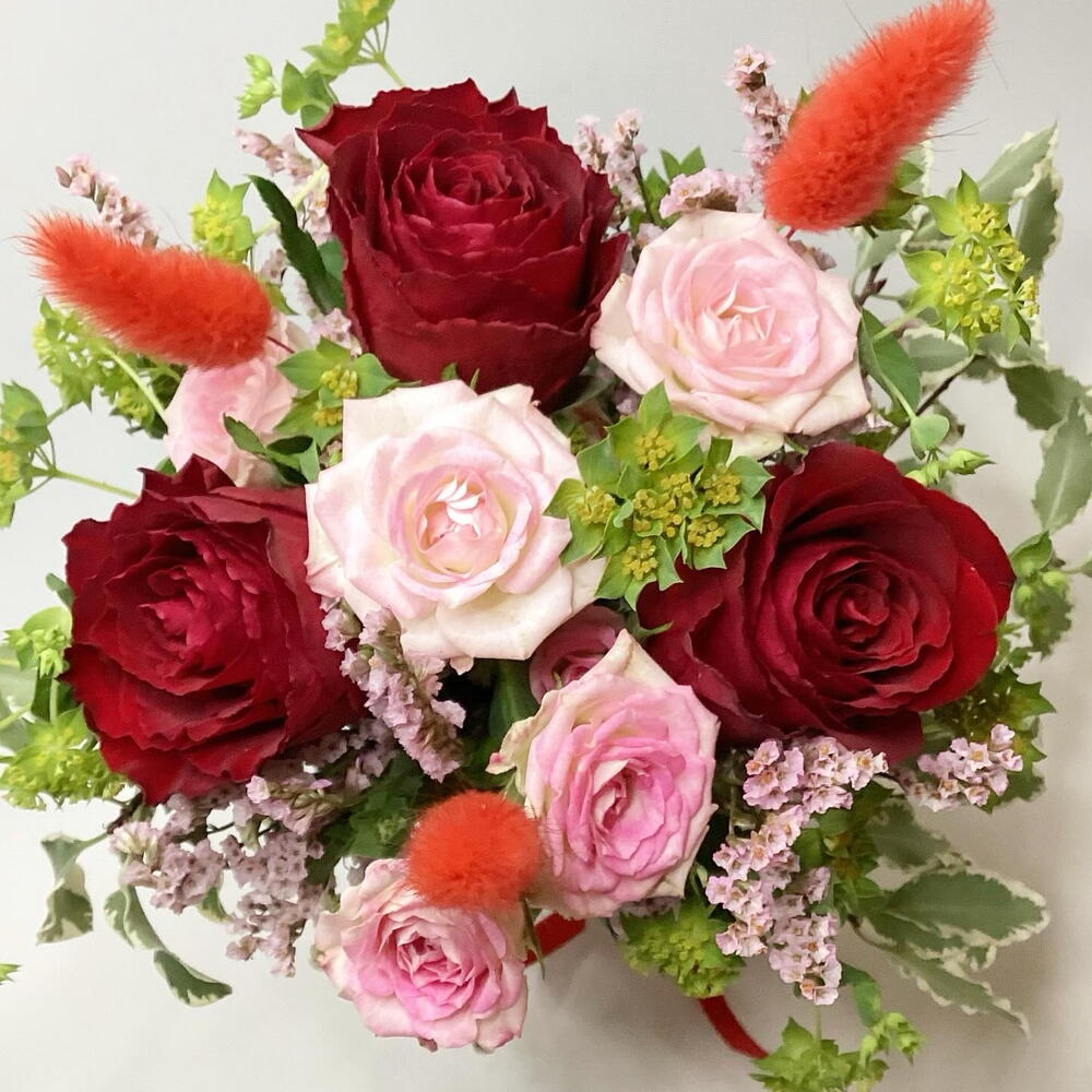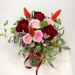 Red rose - 3 pcs pink spray rose - 1 pcs lagurus (dried flowers) - 3 pcs limonium pink - 1 pcs bupleurum - 1 pcs