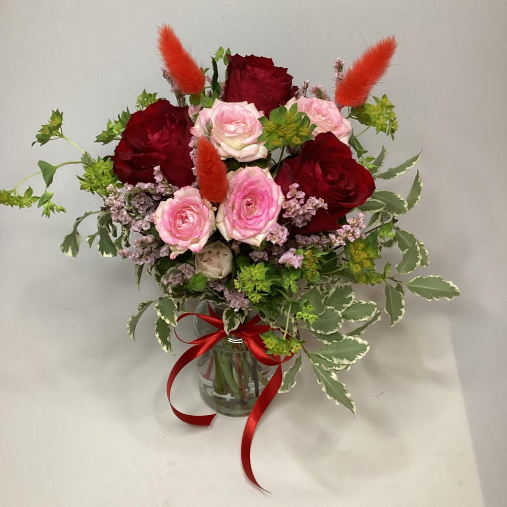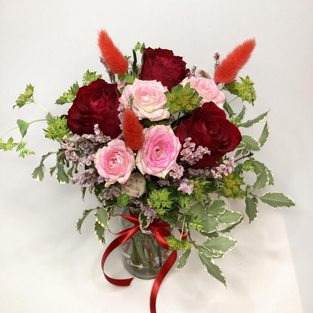A cute small 10cm jar filled with red roses, spray rose, Limonium, bupleurum and dried bunny tails.