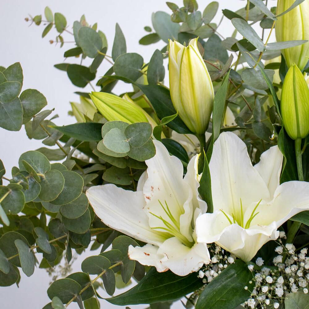 A bouquet composed entirely of white oriental lilies and eucalyptus. Highly aromatic and decorative, our florists have created this spectacular bouquet where green and white take center stage. The recipient will spend the rest of the day smiling and thinking of you.