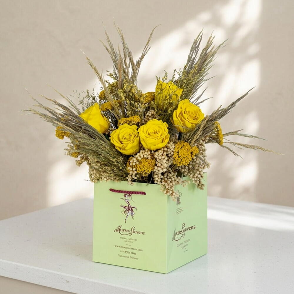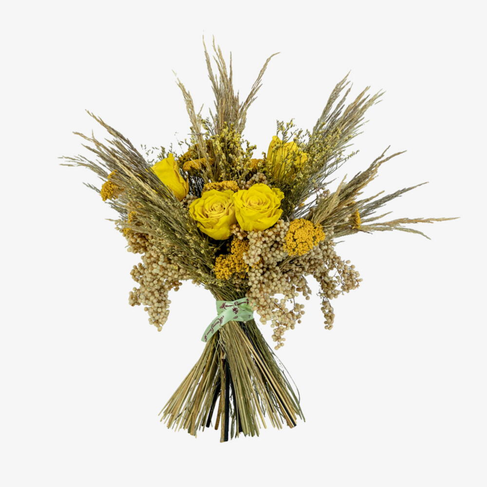 This exquisite bouquet features vibrant yellow flowers, delicate white pepper berries, and a harmonious mix of dried grasses, complemented by the soft hues of limonium and achilea, along with preserved roses. Perfect for adding a touch of warmth and elegance to any room, this long-lasting bouquet requires no maintenance, making it an ideal choice for those who appreciate beauty without the hassle.