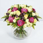 Sweet and soft yellows are the theme this week! Perfectly in line with the golden rays well be experiencing in the coming days. Soft and pastel-like Buttercup roses combine with white spray roses and yellow solidago to give this arrange its golden hues. Contrasted beautifully with pops of colour provided by our purple two-toned roses and dainty astrantia