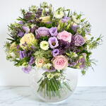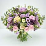 A magical, pastel palette encapsulates this charming design; with roses and lisianthus taking pride of place. Rich purple limonium is accentuated by white nigella in a whimsical floral display. Finished with seasonal greenery, this bouquet will enliven anyones home.