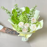 Ribbon - 1 pcs wrapping paper - 1 pcs Eucalyptus systems - 3 pcs hydrangea (green) - 3 pcs garden roses (ivory) - 7 pcs anthurium (green) - 3 pcs stock flower (white) - 4 pcs