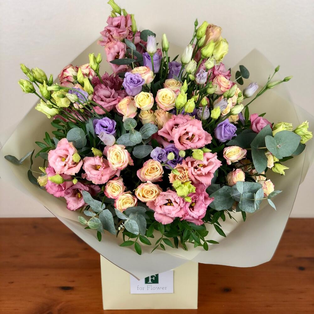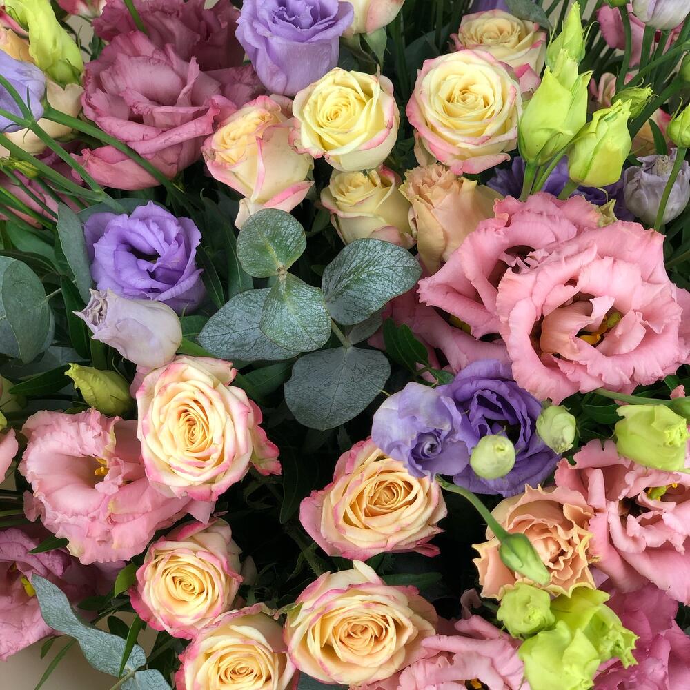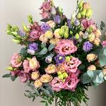 Eucalyptus - 5 pcs Spray rose - 10 pcs packaging - 1 pcs lilac lisianthus - 10 pcs mixed lisi - 5 pcs