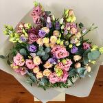 This flower bouquet is a mixture of pink and lilac lisianthus, spray roses and eucalyptus. Little story time: Lisianthus has plenty of core meanings, to name a few: It is the birth flower of Sagittarius' everywhere. Represents the joining of two people for a lifelong bond. Expressing gratitude for a gift or a favor from a friend or loved one.