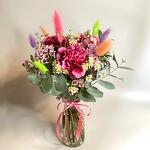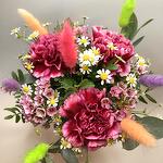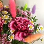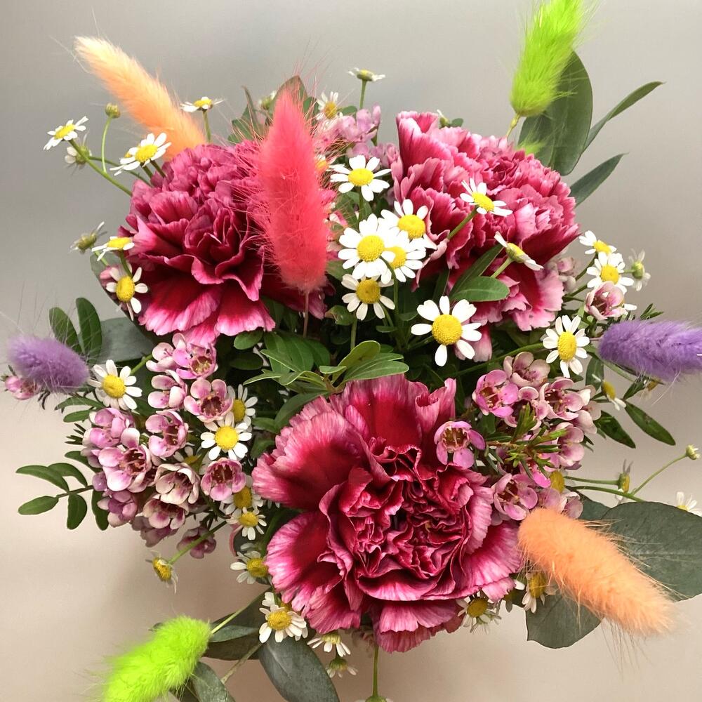 Wax flower - 3 pcs chamomile - 3 pcs vase clear - 1 pcs dried bunny tail - 7 pcs deep pink carnations - 3 pcs