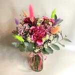 A vibrant little vase of flowers, full of colour. Vase included measuring 12cm in height
