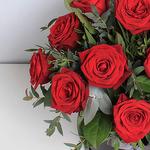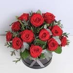 A dozen stunning red roses beautifully arranged in this on trend stylish hat box. Very easy to look after and the ideal Gift for the classy minded flower enthusiast. This design is arranged in floral foam known as oasis. The hat box is completely lined and will need to be kept topped up with water to ensure it lasts.