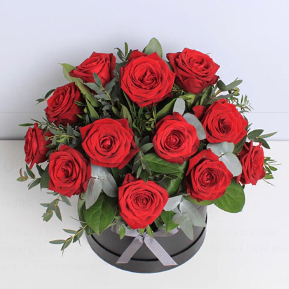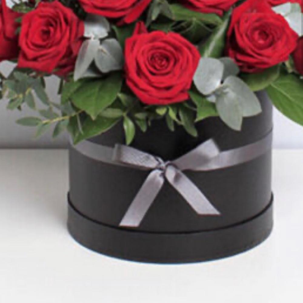 A dozen stunning red roses beautifully arranged in this on trend stylish hat box. Very easy to look after and the ideal Gift for the classy minded flower enthusiast. This design is arranged in floral foam known as oasis. The hat box is completely lined and will need to be kept topped up with water to ensure it lasts.