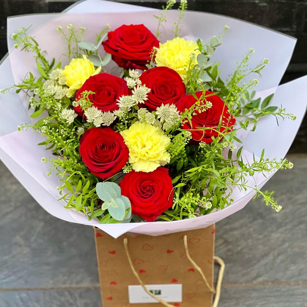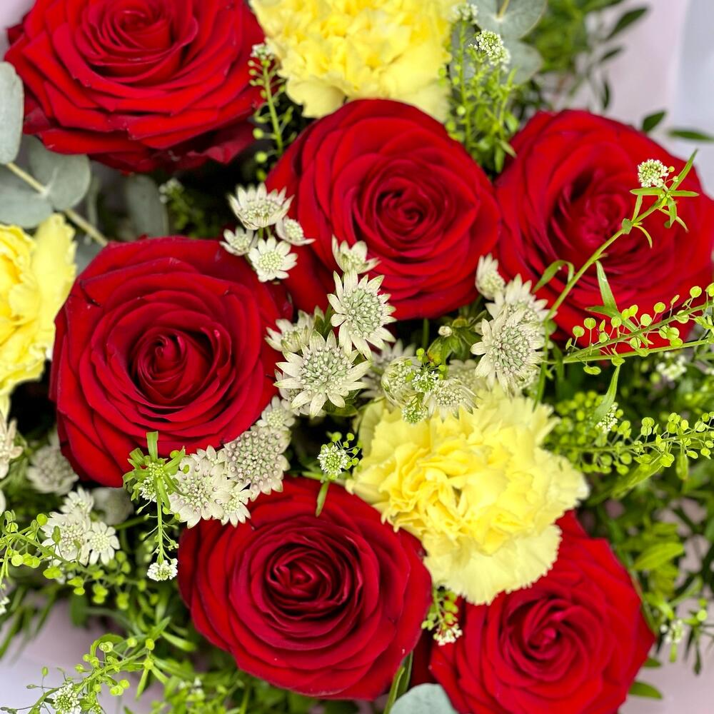 Introducing our romantic "Love is in the Air" bouquet - a stunning combination of deep red roses, elegant alstroemeria, lush green bells, and delicate carnations. This bouquet is the perfect way to express your love and affection for someone special. Our expert florists carefully handpick each stem and artfully arrange them to create a unique and stunning bouquet that will leave a lasting impression. The deep red roses symbolize love and passion, while the elegant alstroemeria and delicate carnations add a touch of refinement and grace. Whether you're celebrating an anniversary, Valentine's Day, or just want to show someone you care, the "Love is in the Air" bouquet is the perfect choice. Order now and let us help you create a moment of natural beauty that will be cherished forever!