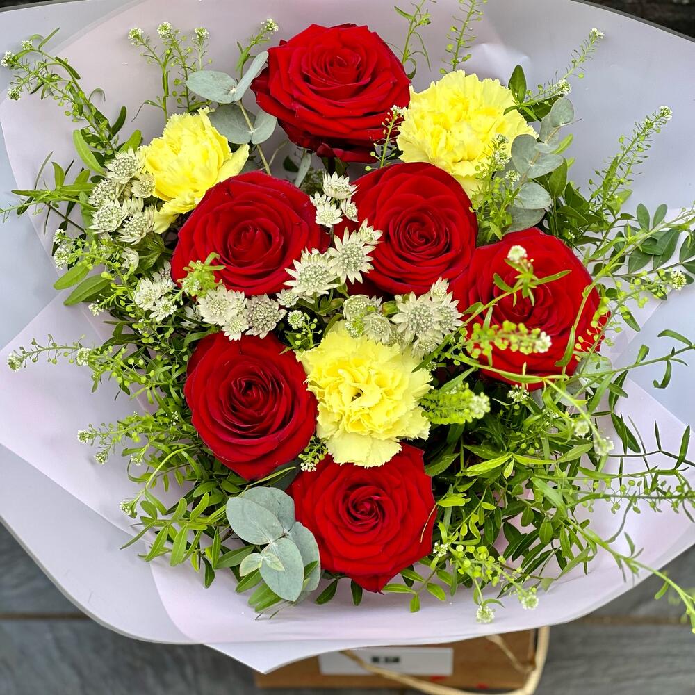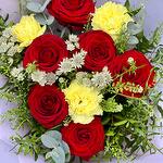 Red rose - 6 pcs Alstroemeria - 2 pcs Green bell - 1 pcs carnations - 3 pcs packaging - 1 pcs