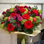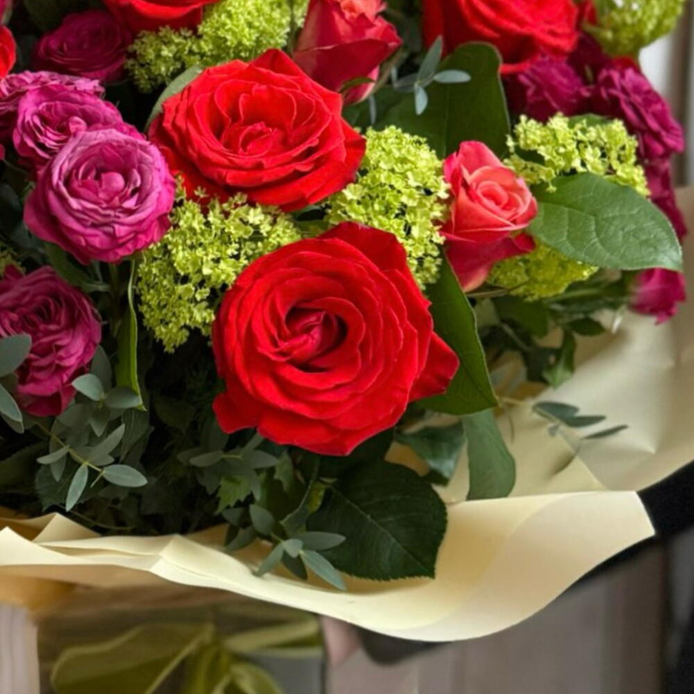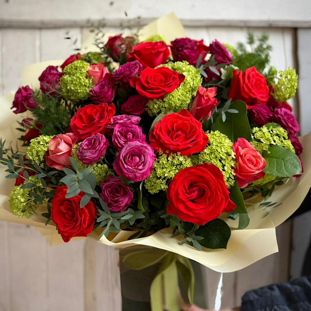 Beautiful large bouquet with premium roses, viburnum and eucalyptus, gift wrapped and in a gift box