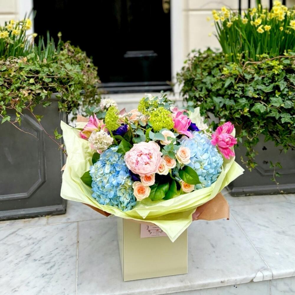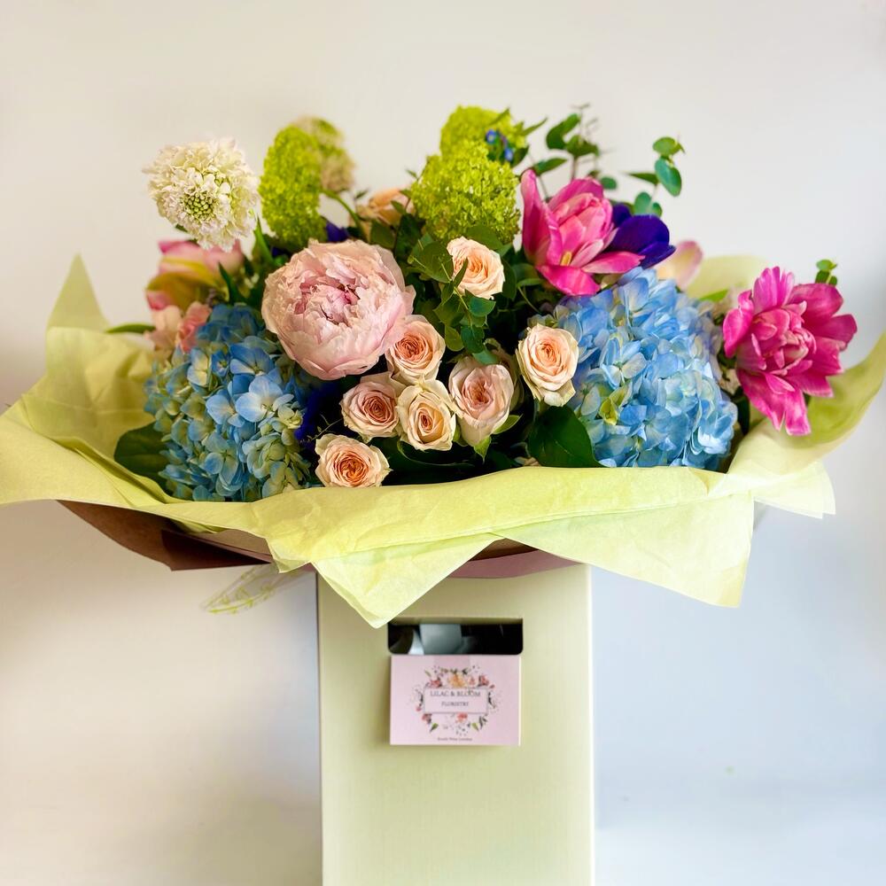 Large bouquet of luxury flowers, delivered with a hand written message card and in a gift box.