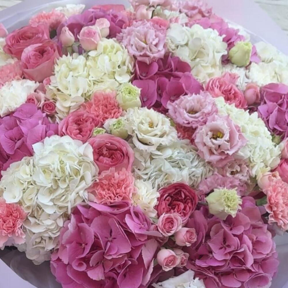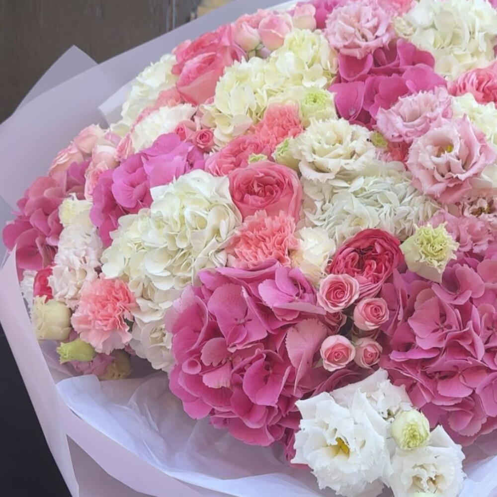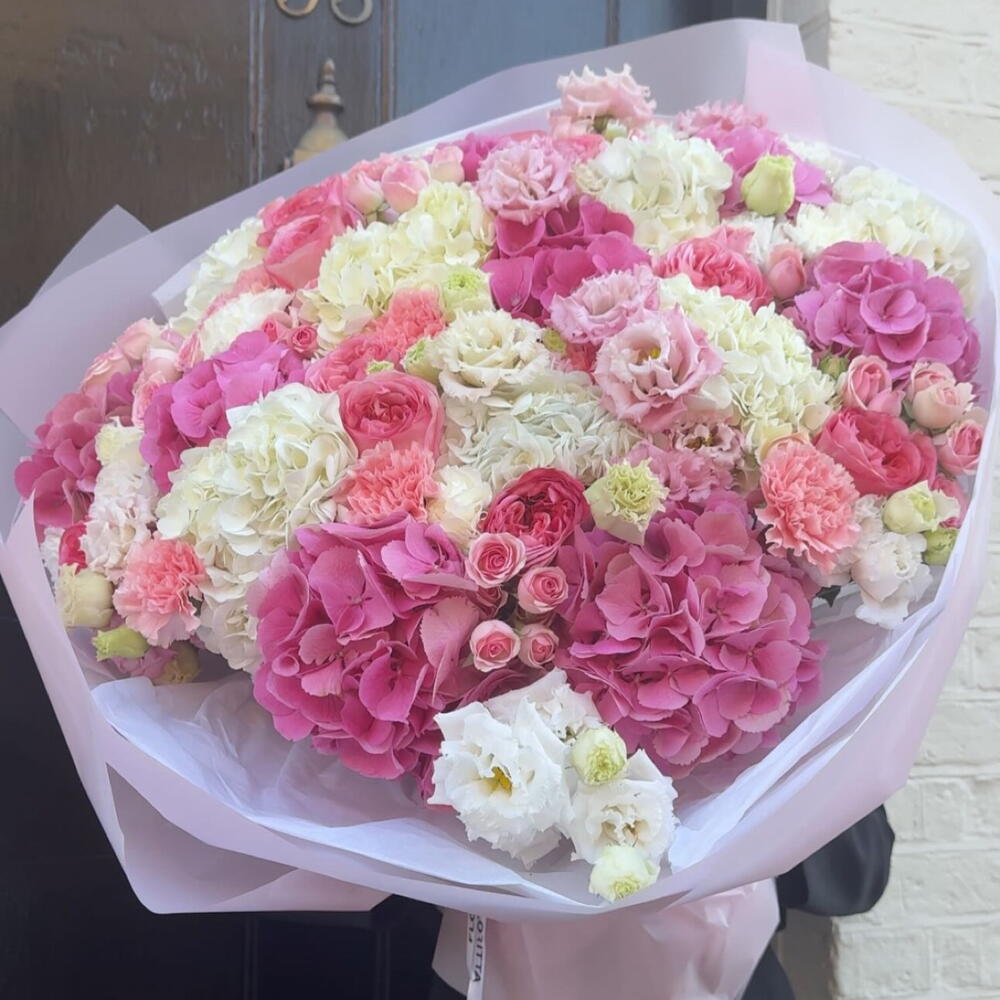 A luxurious pastel bouquet featuring hydrangeas, roses, lisianthus and carnations. Soft, elegant tones create a refined and romantic look, perfect for anniversaries, special celebrations or gifting someone truly special. Designed to impress with its size and premium flower selection.