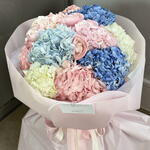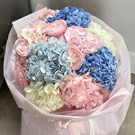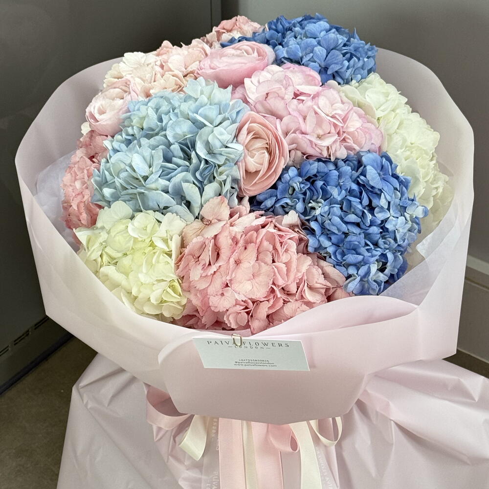 Elegant pastel bouquet with premium hydrangeas and roses, designed in a soft romantic style. Perfect for gifts and special occasions. Note: Depending on seasonal availability, ranunculus may be replaced with pink roses while keeping the same delicate look.