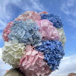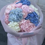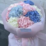 pink hydrangeas - 5 pcs blue hydrangeas - 3 pcs white hydrangeas - 2 pcs pink ranunkulus - 3 pcs