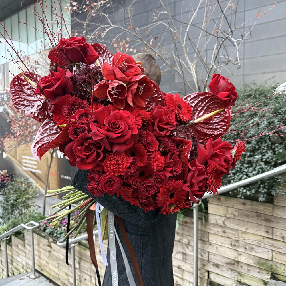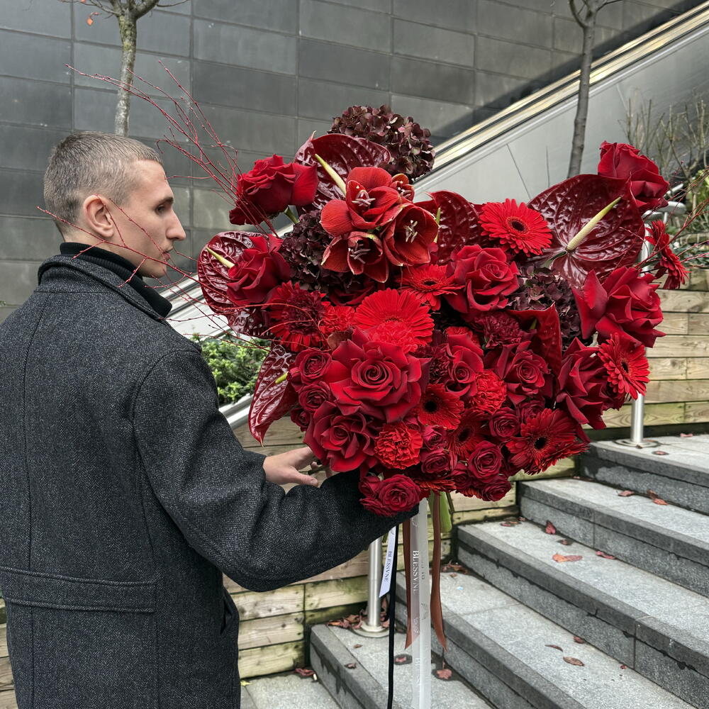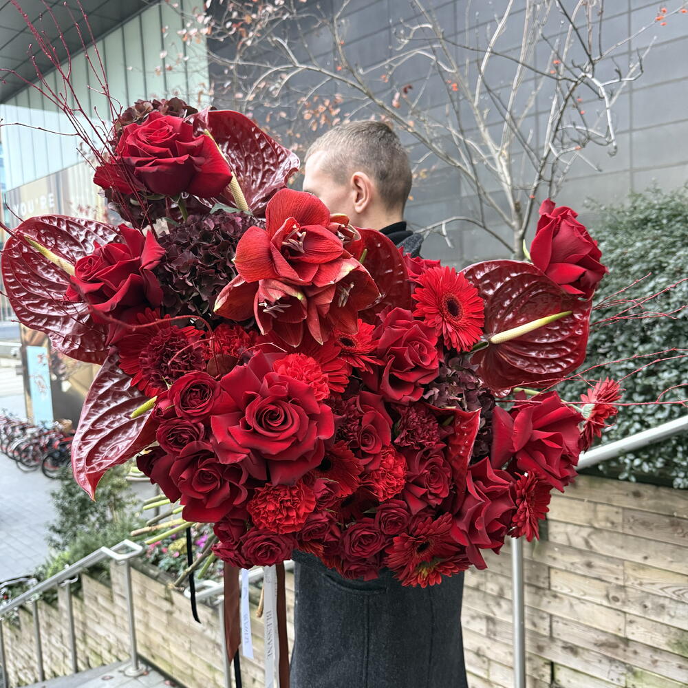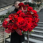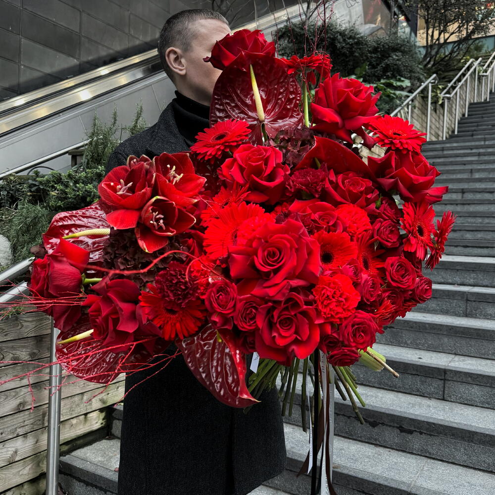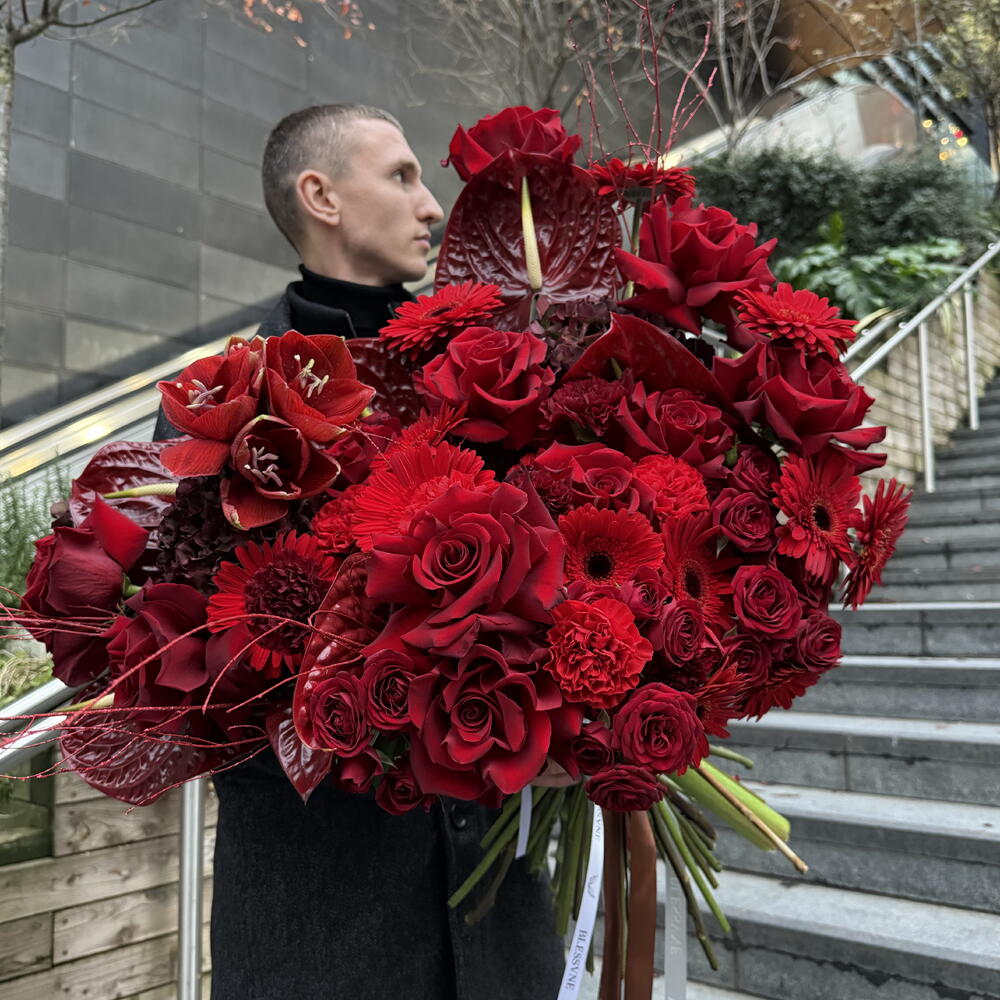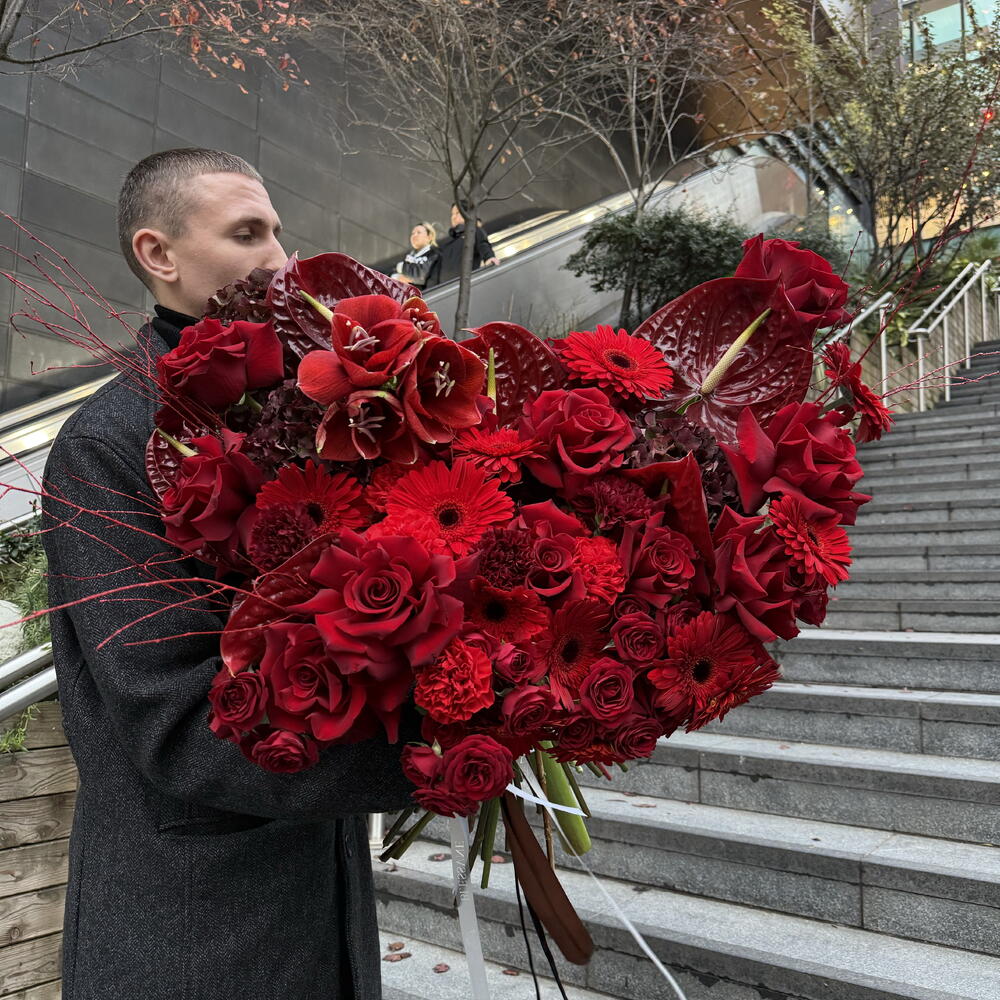 This authors bouquet follows the trends of modern floristry. It consists of 10 pcs. of elegant gerberas, 6 pcs. of exotic anthuriums, 5 pcs. of delicate hydrangeas, 10 pcs. of classic carnations, 10 pcs. of luxurious delicate buds of spray roses and 15 pcs. of chic French roses. Created to convey your strongest emotions and feelings!