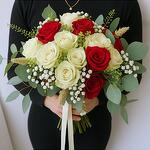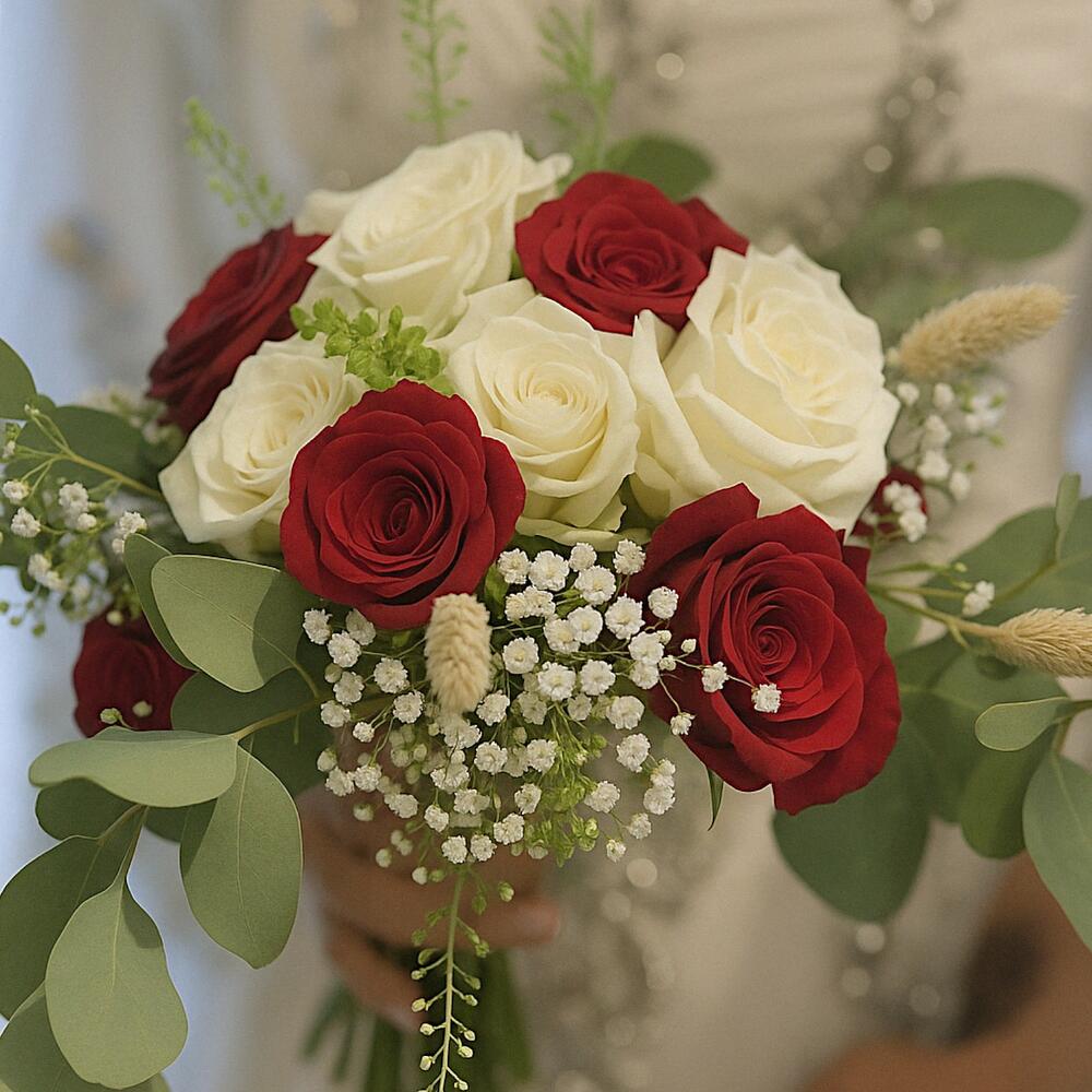 Satin ribbon - 1 pcs pampas grass (dried flower) - 16 pcs red roses - 12 pcs white roses - 12 pcs green bell bunch - 1 pcs baby breath bunch - 1 pcs