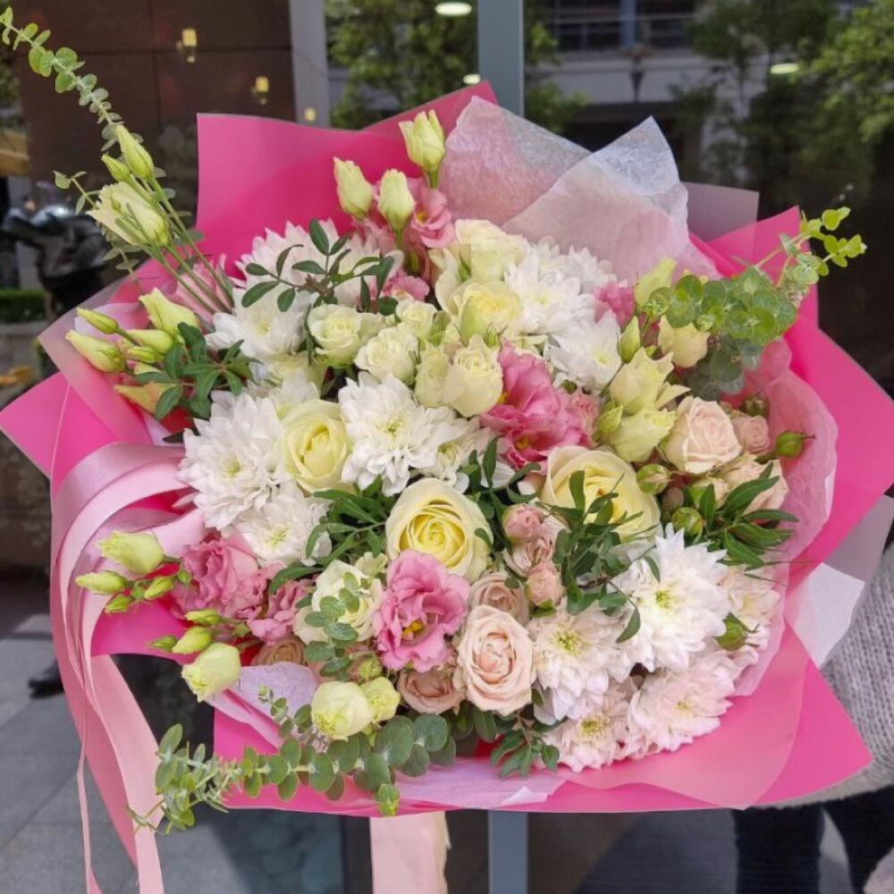Eustoma white - 6 pcs rose white - 8 pcs chrysanthemum bush - 6 pcs pink spray rose - 5 pcs white spray rose - 5 pcs