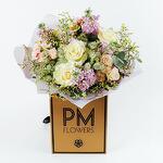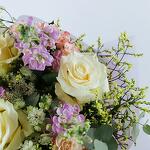 Meadow luxury hand-tied bouquet featuring Roses, Spray Roses, Stock, Astrantia, Limonium.