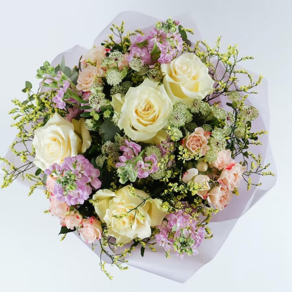 Meadow luxury hand-tied bouquet featuring Roses, Spray Roses, Stock, Astrantia, Limonium.