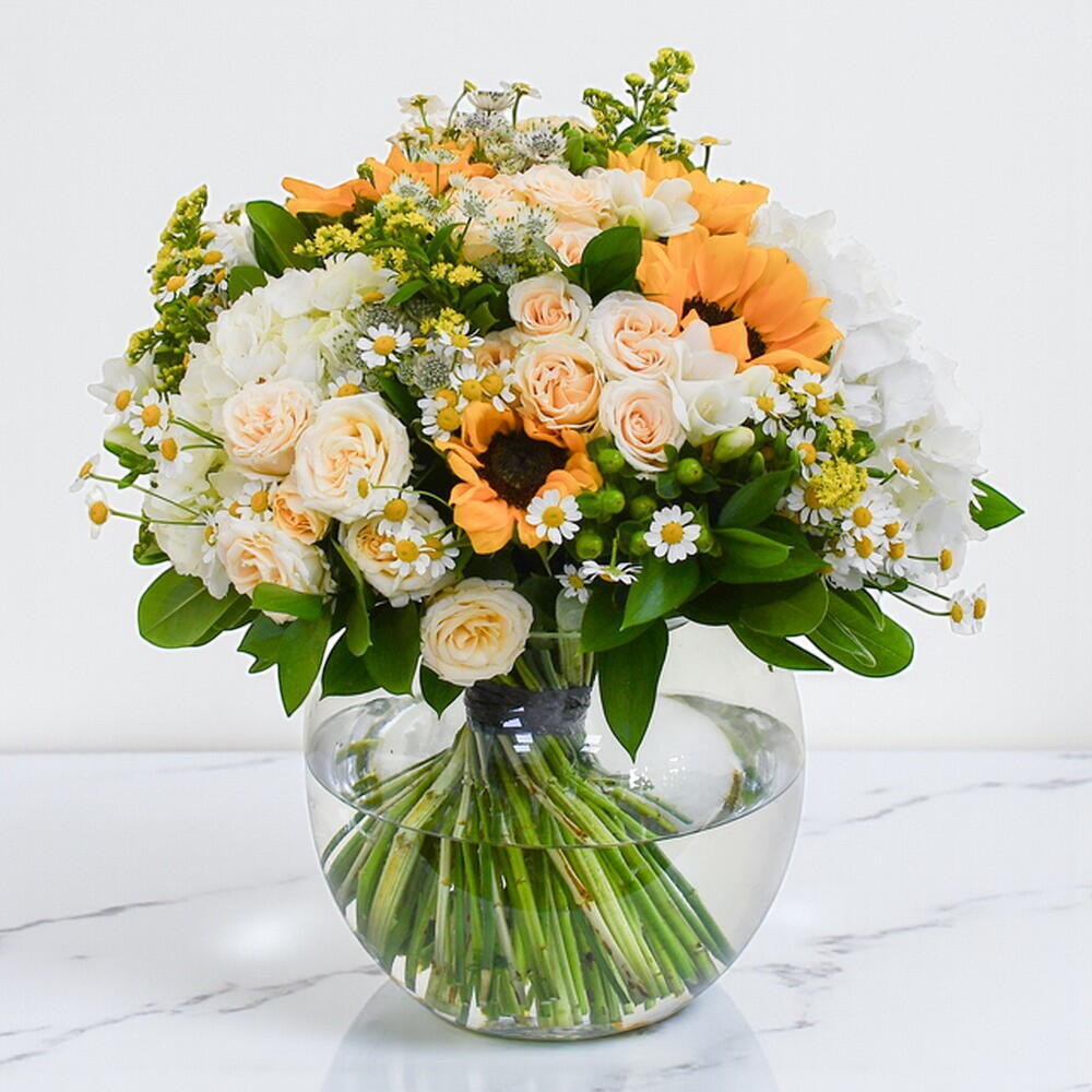 This distinguished arrangement showcases the botanical harmony of sunflowers, hydrangea, and freesia—each variety selected at peak freshness for optimal visual impact and longevity. Meticulously hand-crafted by our master florists, the composition balances vibrant colour with sophisticated structure.