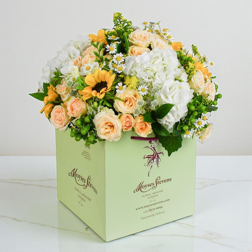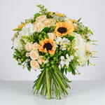 This distinguished arrangement showcases the botanical harmony of sunflowers, hydrangea, and freesia—each variety selected at peak freshness for optimal visual impact and longevity. Meticulously hand-crafted by our master florists, the composition balances vibrant colour with sophisticated structure.