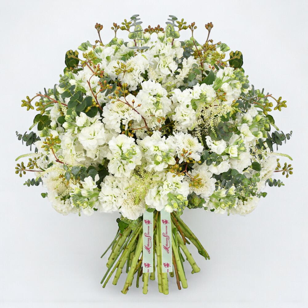 Crisp white stocks with their softly perfumed blooms compete with the delicately fragrant eucalyptus to make this sweet scented bouquet. A classic colour palette of pure whites using some of summers finest from soft and fluffy astilbe to the dainty scabiosa scattered throughout. This bouquet combines a classic and timeless colour choice with a delicious soft fragrance throughout.