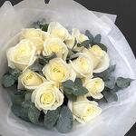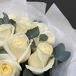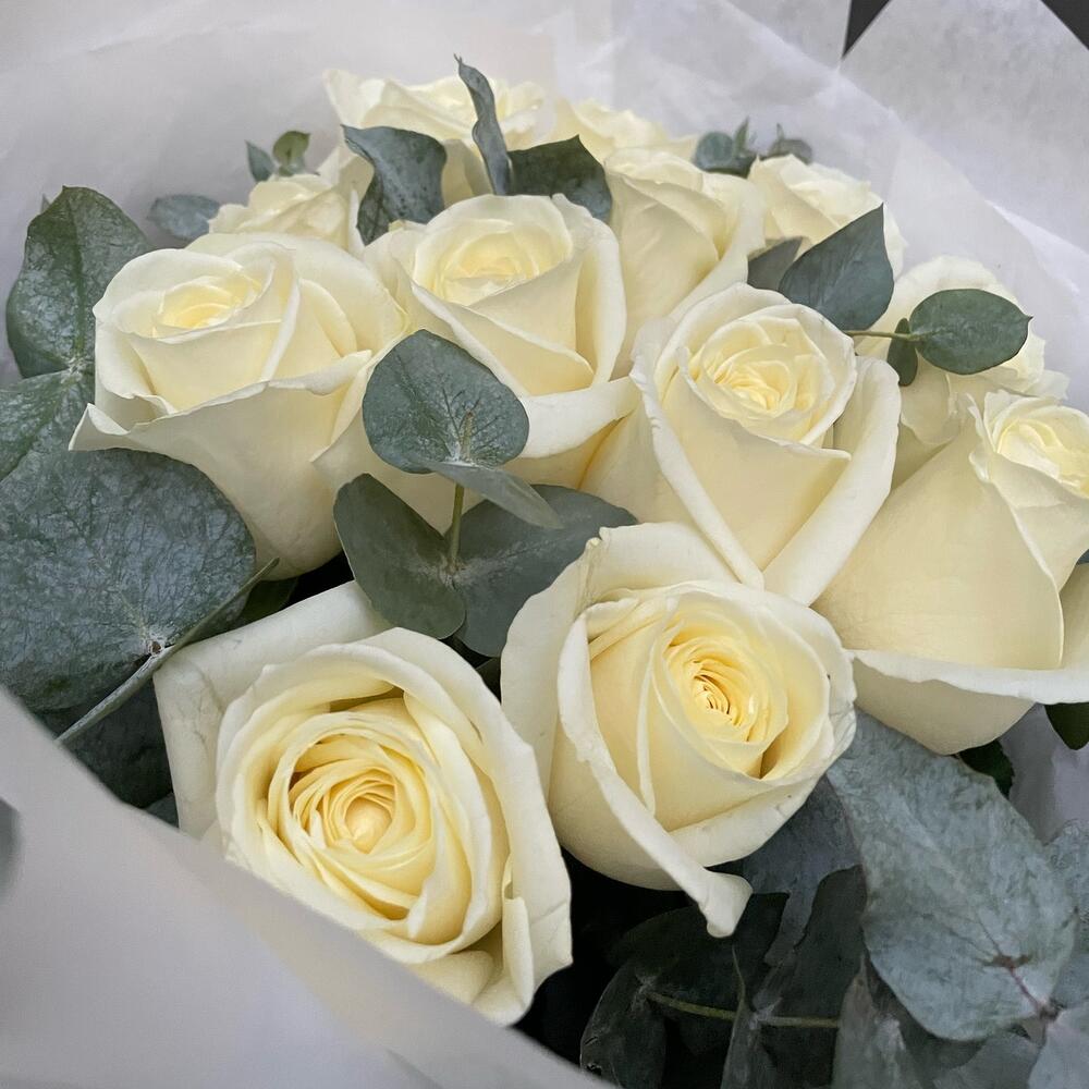 12 white roses with eucalyptus