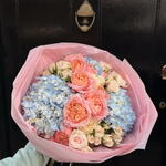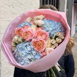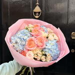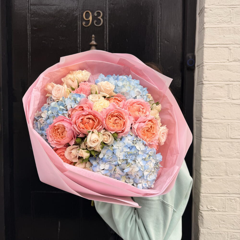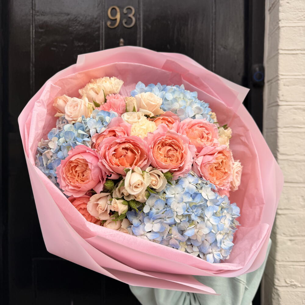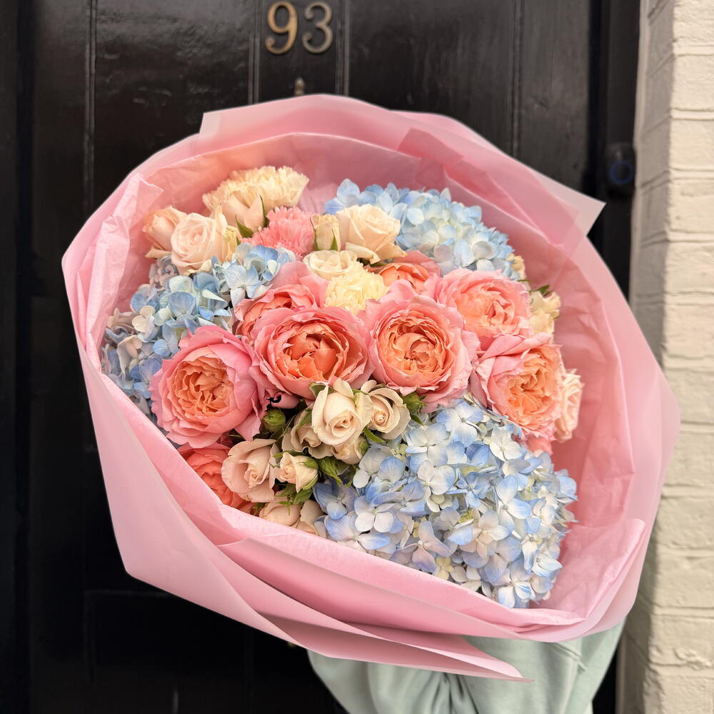 A dreamy blend of peach garden roses, soft blush spray roses and airy blue hydrangeas, wrapped in delicate pink tones — a beautifully romantic composition that feels light, fresh and effortlessly elegant.