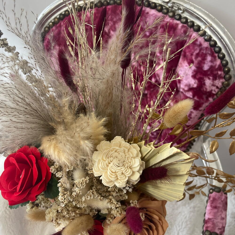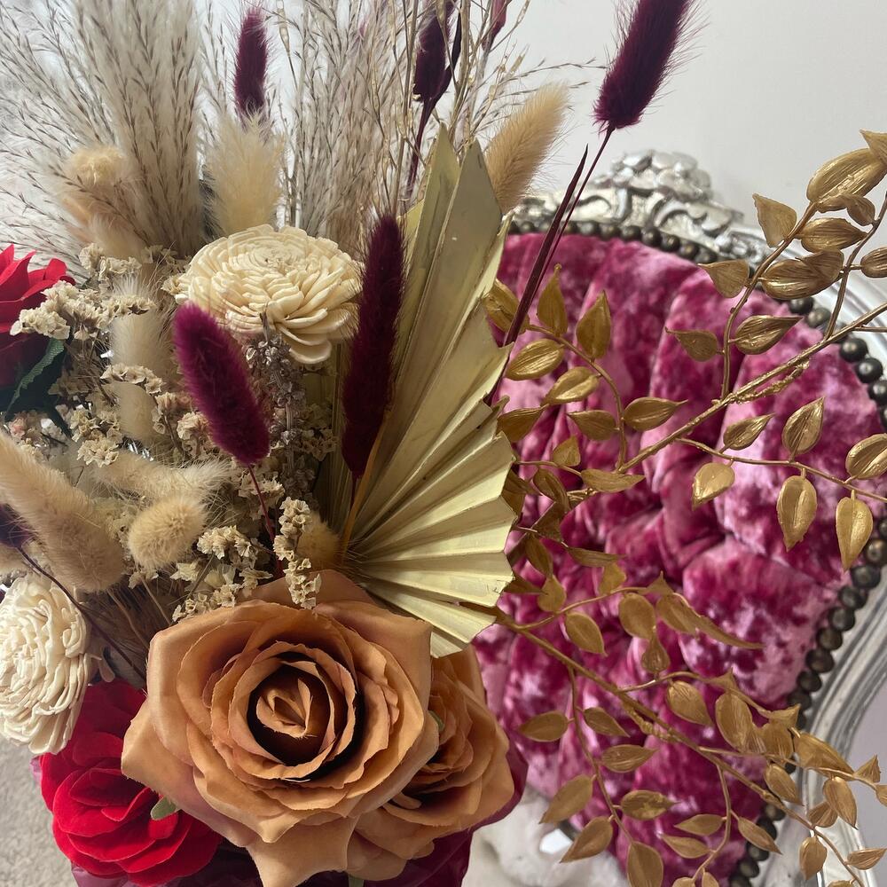 vase clear - 1 pcs bunny tails grass - 10 pcs tissue paper - 2 pcs pampas grass - 1 pcs palm leaf - 1 pcs dried gypsophila - 2 pcs artificial red roses - 2 pcs spray gold leaves - 1 pcs artificial coffee rose - 2 pcs